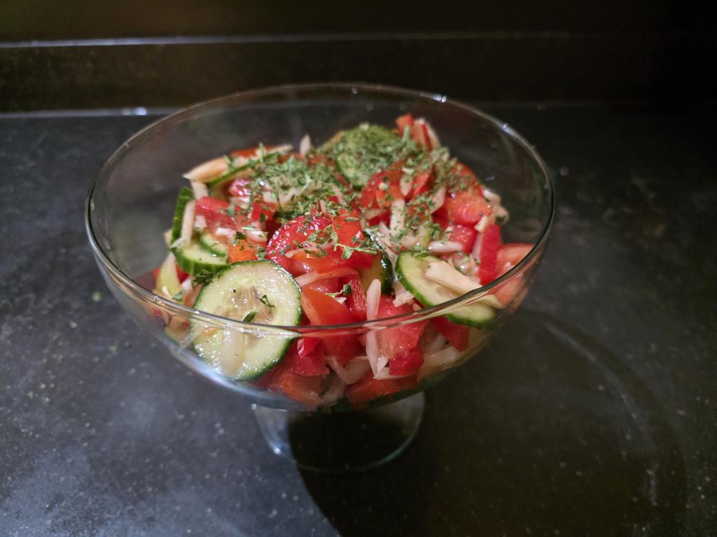 Komkommersalade met gebakken chorizo