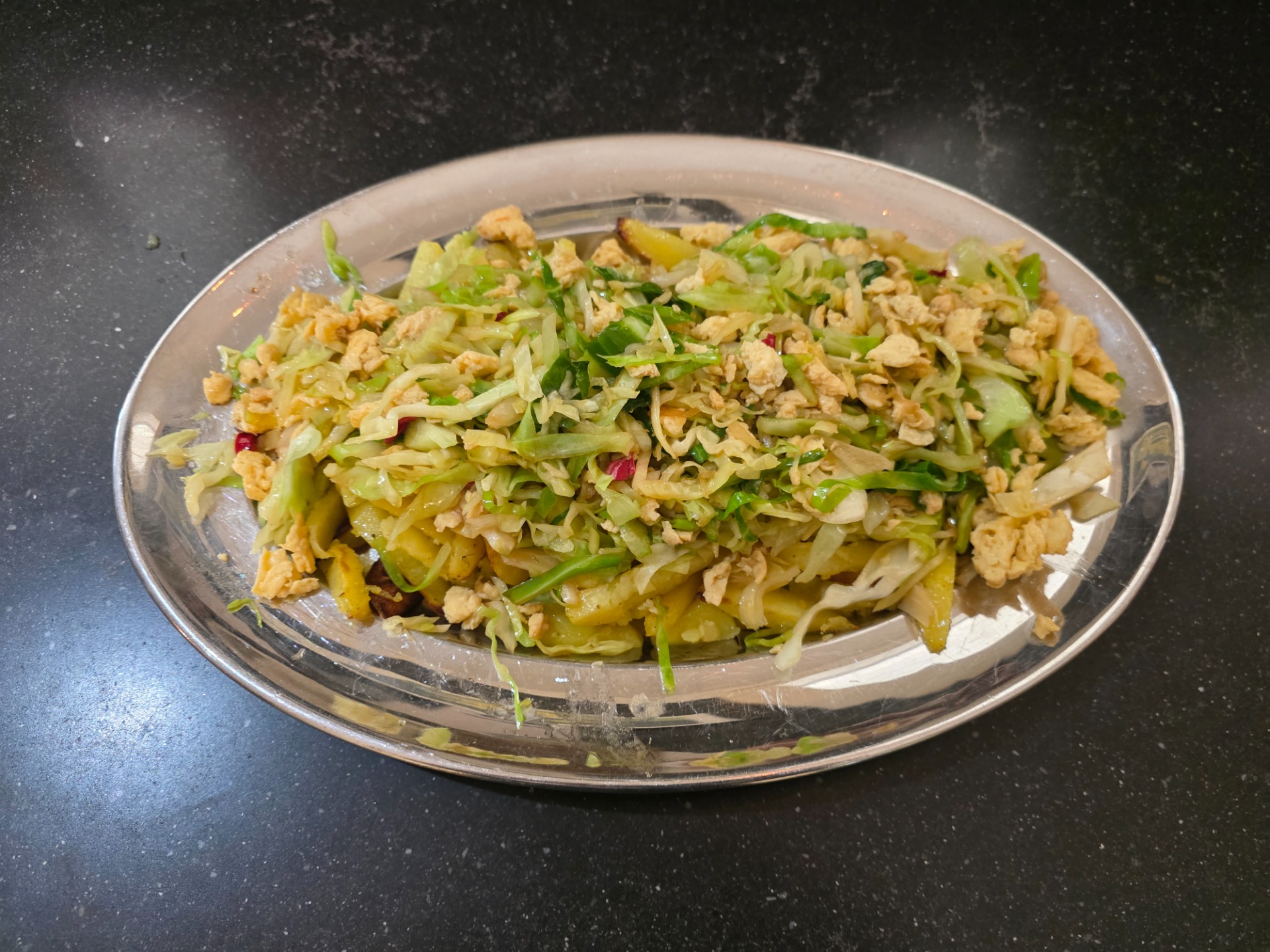 Krokante biefstuk met  aardappelfrietjes en witte kool
